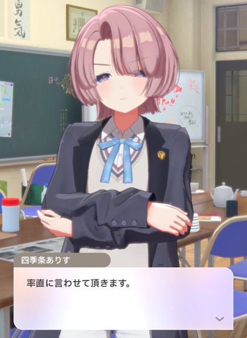 制服大体わかってきたぞ… 手毬が着てるボレロスタイルが指定冬服デザインで、美鈴のベストスタイルが中間服。 冬服はオーバースカート&ボレロか、ブレザーの選択。 色違いボレロとブレザーはみんな別オーダー扱いなのかな。 #学マス
