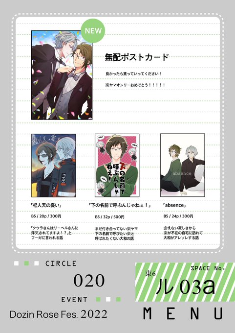楽ヤマオンリーで配る無配ポストカード。よかったらもらってってください+お品書き作った