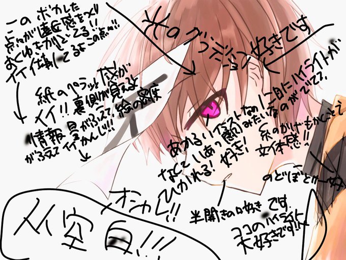 どちらも光のグラデーションが本当に綺麗で、それなのに顔がにやっとしてたり、闇がある感じっていう対比が非常に好みです!!後一つ一つの作業(線画や素材感など)が丁寧で、尊敬です!