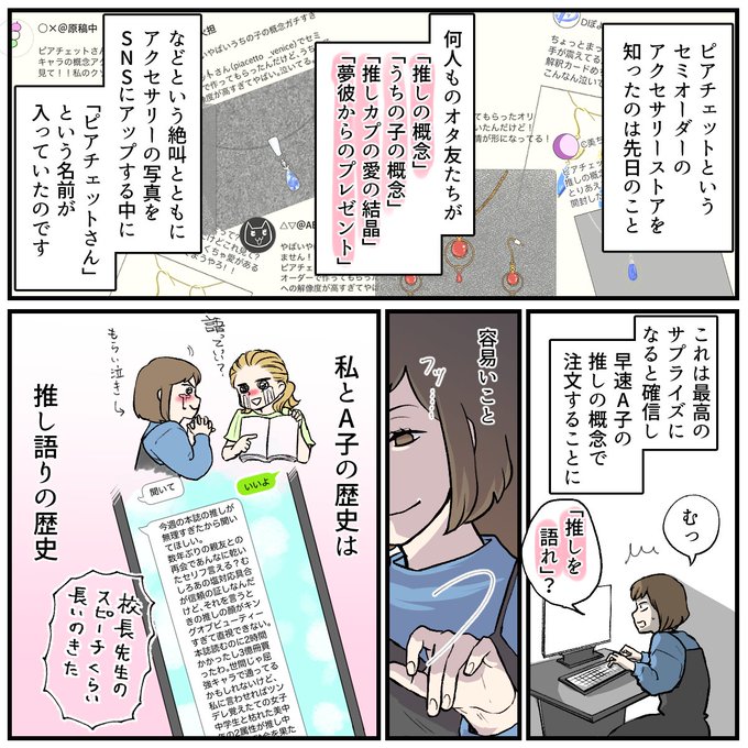 推しの概念アクセサリーを作ってくれるピアチェットさん(@piacetto_venice)のPRを描かせていただきました! 今回は「最高のギフト」編。推しを拗らせている大切なお友達、フォロワーさんの涙腺をボッコボコにしてみませんか? 【1/2】 #piacetto_venice #ピアチェット #推し #概念アクセ