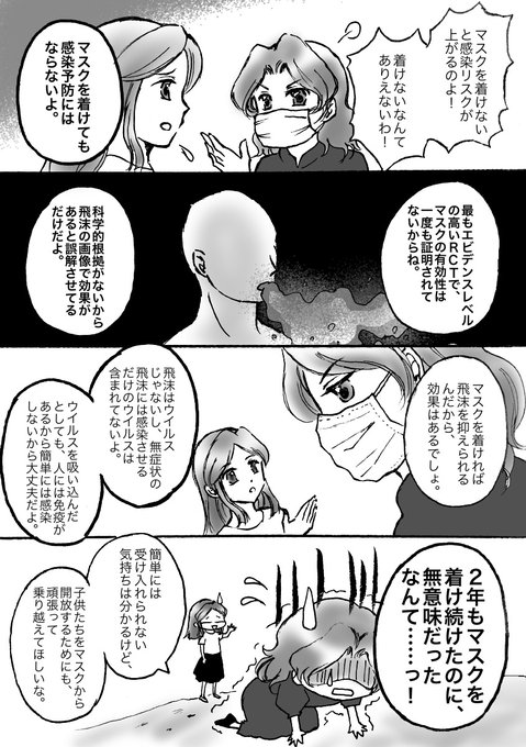 だから脱マスクと「マスクが感染を防がないと伝えること」はセットで進める必要があります。マスクが感染予防にならないこと・つける必要がないことを伝える漫画をまとめたのでお使いください。