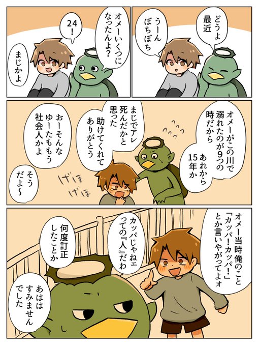 大人になった青年と否定する河童