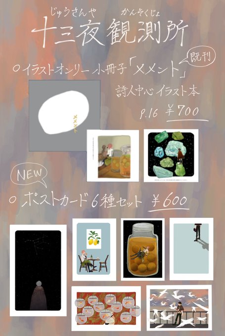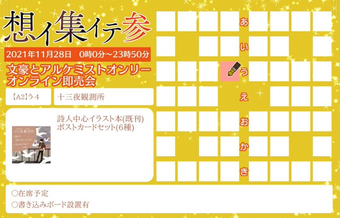 2021/11/28 pictSQUARE内オンライン即売会 想イ集イテ参 A2 -う4 十三夜観測所 詩人中心イラスト本の再販&ポストカードセット(6種)を置く予定です #想集参 #想集参_参加