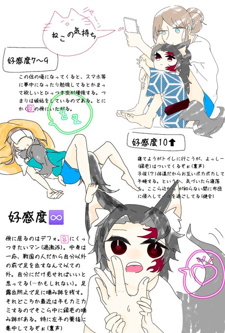 ショタ化🌙さんの好感度は最初はマイナスだけど過ごしてく中で、🌙が考えを変えるきっかけがあって🚺に懐くようになる。好感度カンスト後は☀️同様、隠れてベッタリ。黒死牟化(目が6つ)は警戒心MAX。巌勝化(目が2つ)は警戒心ZERO。獣耳ショタは良いぞ良いぞ〜