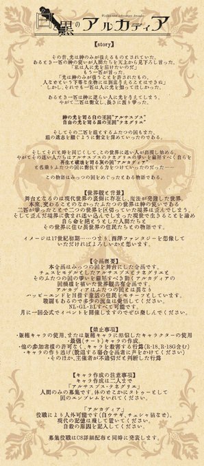 #創作企画 世界観共有企画【白と黒のアルカディア】 フォロワー様が20名を越えましたら活動を開始させていただきたいと思います。 何かご質問などありましたらDM、リプでお問い合わせください。