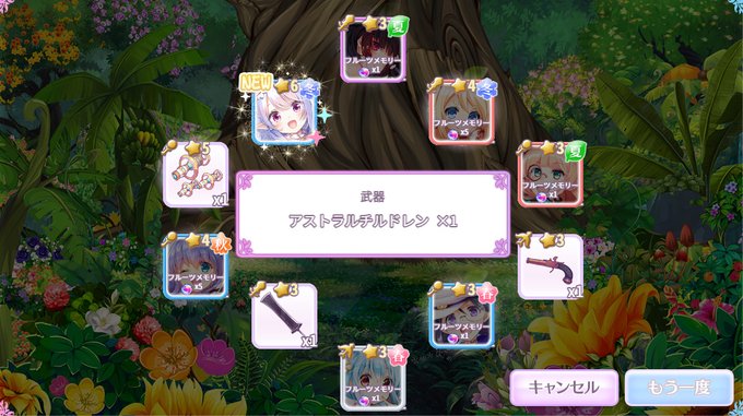 んあ~引き直しガチャようやく終われるぅ~~><; お目当てはヒナソウ+メコorグロリアサ+αでした もう疲れたよ・・・パトラッシュ・・・ #花騎士