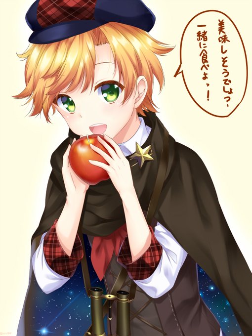昨日文アルで賢治くん来てくれた記念に!!りんごどうぞって言ってたんで持たせてみた。 フリーハンドで描いたから望遠鏡歪んでるけど。