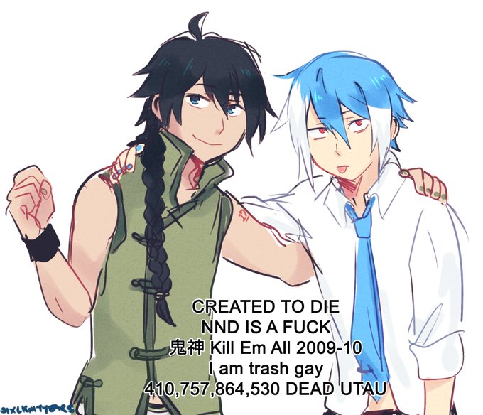 CREATED TO DIE NND IS A FUCK 鬼神 Kill Em All 2009-10 I am trash gay 410,757,864,530 DEAD UTAU