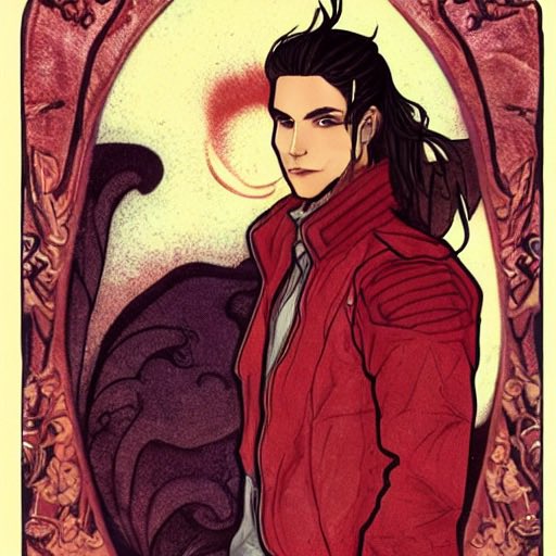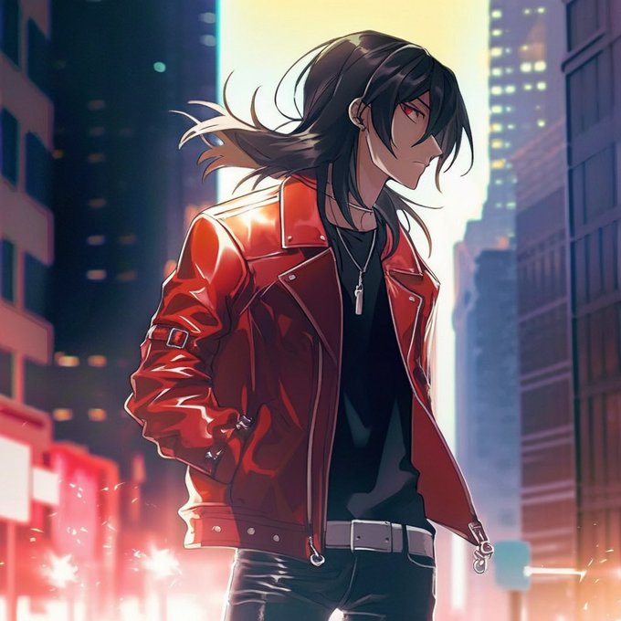 Beautiful young male, handsome, beautiful red eyes, black hair, long hair tied at the nape of neck, crossed bangs, red leather jacket, serious face