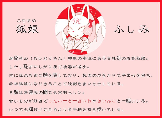 ふしみちゃんと狐たちの紹介です。二年程前にも一度公開した設定です うちの狐たちは皆が御稲荷山(おいなりさん)神社とその参道との世界線でつながっているという設定 羊毛フェルトとかできつねこたちのキャラグッズもつくってみたいです