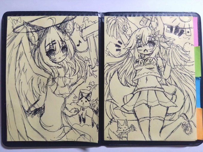 講義の合間に描いてた付箋の落書きはコミ1用色紙・コミ1明けの新規イラストのラフ決めに直結してた物であり、修羅場真っ只中であっても次の絵描き行動へ移れる様に段取ってたらしいですよ。