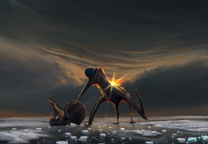 Sketch and closeups. I used Scott Hartman’s 2016 Shonisaurus as ref, pterosaurs are quasi Carniadactylus AND THE ECTOPARASITES ARE SPECULATIVE. We don’t have direct evidence that they hosted any, but I figure slower ones might have less invasive barnacle-like creatures on em