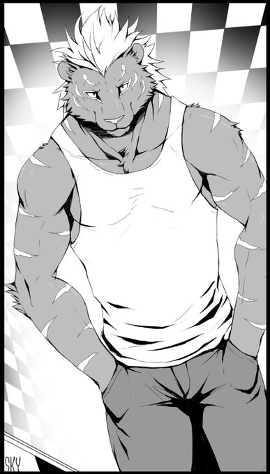 けもケ5で頒布予定の本の主人公の黒い虎さん。 タンクトップ愛好家。