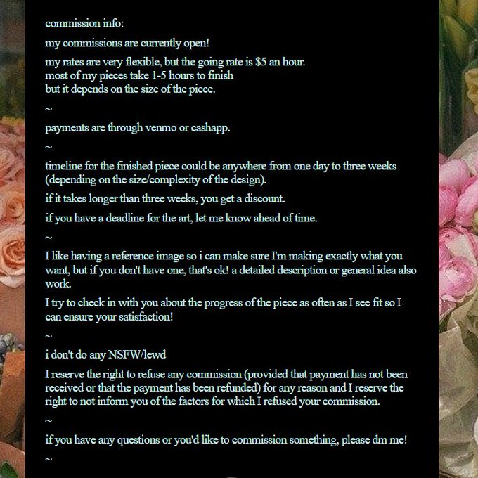 if you have questions or want to commission something, feel free to dm me! i have flexible rates + i'm willing to work with your budget if you're worried about price!