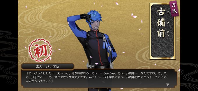 刀剣乱舞8周年おめでとう。新たな推し刀剣が出来た。人間無骨ちゃん、可愛すぎる。ご褒美に茶器貰える?とか言うし、マジで戦ってる時とのギャップがすきすぎる。しかも跪坐絵だと他の槍薙刀達より体格小さめでかわいい。2本目まで死ぬ気で取りに行けば良かった。あと八丁🍡出た。