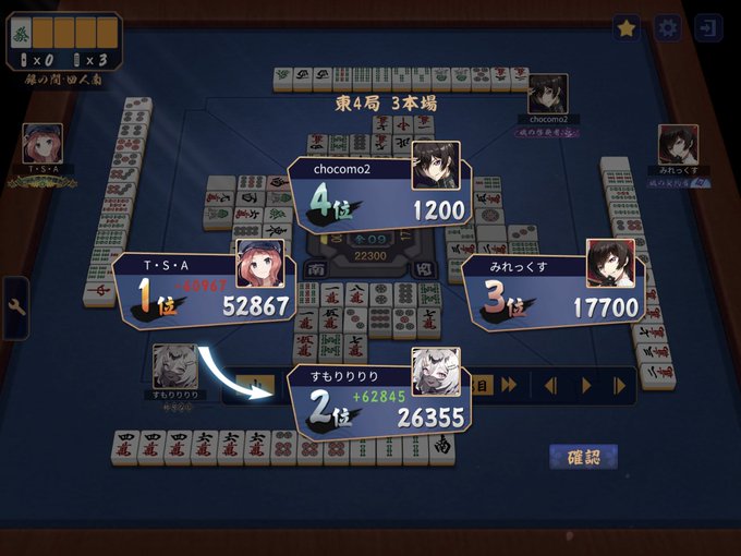 四暗刻は何回か上がったけど、単騎は初めてだったから嬉しい〜 50000点持ちの1位でも一気に4位になる恐ろしさよ