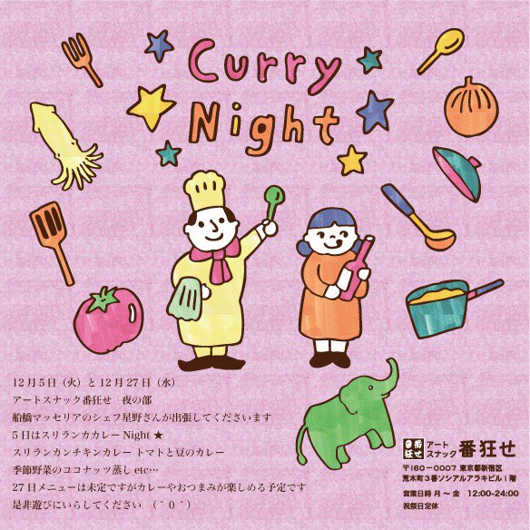 【12月5日 夜の部】今夜は船橋マッセリアのシェフ星野さんが出張してくださいます スリランカカレーNight★です 星野さんとお待ちしてます ぜひ遊びにいらしてください 今月の展示は奥田実穂さんの写真展です ☺️(エレナ)