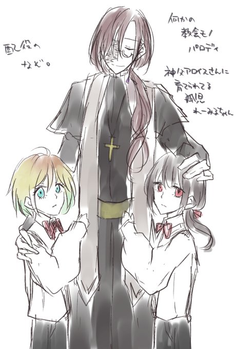 割と素っ頓狂な配役のセルフパロディをすることに定評があるのですが、我ながら性癖ぶん殴ってきた神父アロイスさんと双子れーみるちゃんwithエルネストくんをみてもらえませんか?
