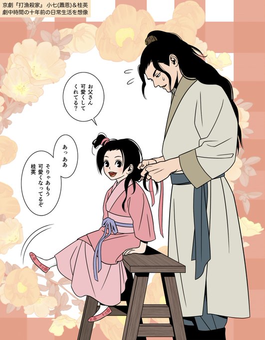 京劇『打漁殺家』の小七とその娘の桂英。桂英は父親と一緒に漁をしたり、劇中で刀を持って大立ち回りしてるからお転婆な娘さんなんだろうなと思ったので活発な感じにした。父娘の二人暮らしだからこんな事もあっただろうなと想像。キャラのビジュアルはドラマ新水滸伝に準拠。(桂英は瓊英を参考にした)
