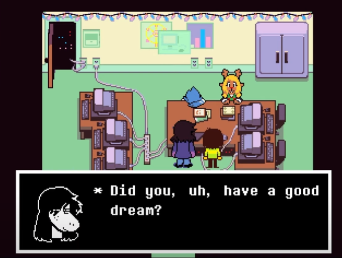 and then kris, noelle, and susie all wake up and are back. from what noelle assumes is just an alarm from berdly but ..