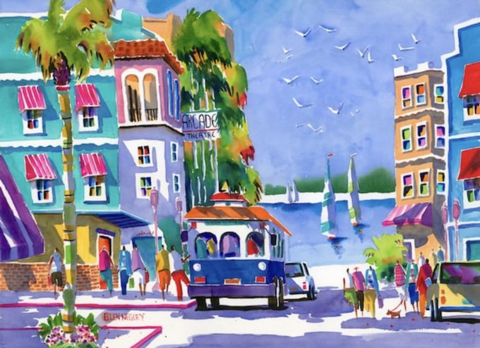 These colorful little row boats were fun to paint, but also a challenge because of the perspective. I especially liked adding the shadows to try and make things like the oars and buoys pop. I added a sleepy little kitty cat just to give it some life!