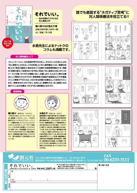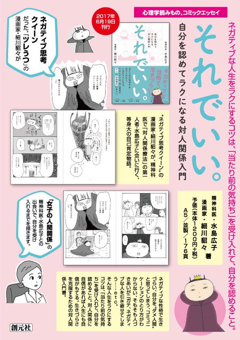 6月刊行『それでいい。』。ネガティブ思考クイーンの漫画家・細川貂々が、精神科医で対人関係療法の第一人者・水島広子に会いに行ったら──。なんとなく「生きづらいな……」と感じるすべての人に、エールを送る1冊です。立ち読みはこちら.G https://t.co/w4FFiJH27Z