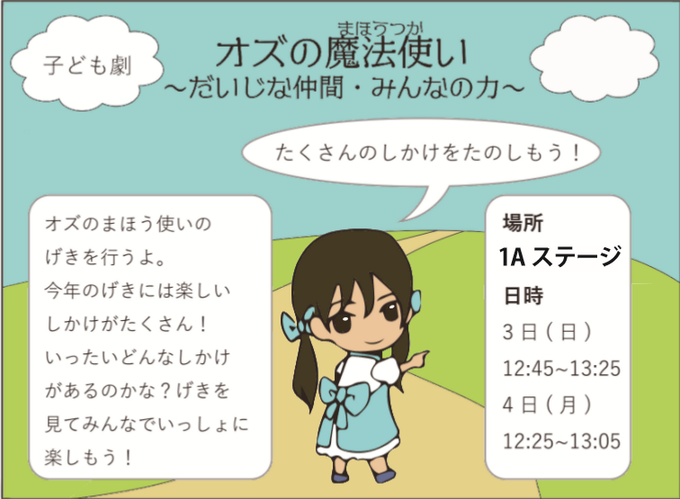 今年の子ども劇は、「オズの魔法使い」を上演します。子どもたちだけではなく、劇を見に来てくれた人みんなが楽しめる仕掛けが盛りだくさんです!今年新設された1Aステージでお待ちしています!!