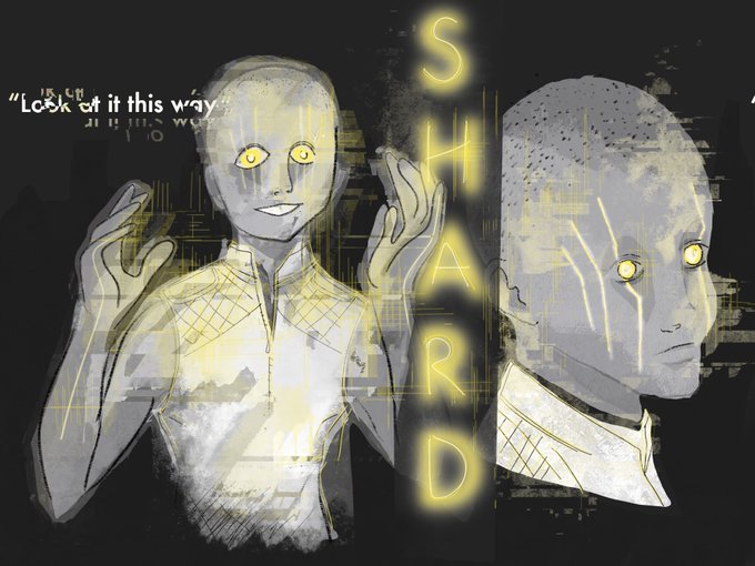 One of my current ttrpg characters - first full session for me today and the art is already outdated - Shard lost their right arm in a gun fight 🤣