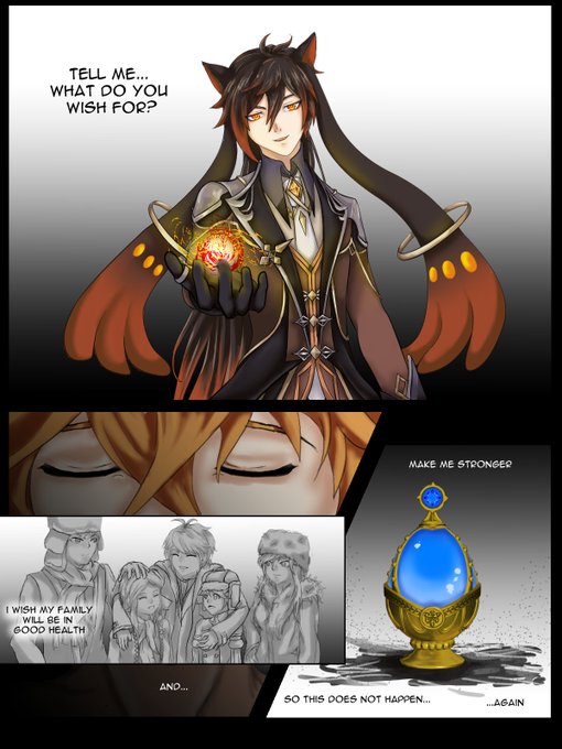 In a dark room... there the Harbringer Tartaglia is petting the rumored dragon's mane, head lying on his crossed knee like an oversized dog.