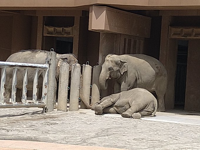 さくらちゃんがお昼寝してる間アヌラさんはお隣のワルダーさんとお話してた🐘🐘 何度か寝てるさくらちゃんをお鼻でちょいちょい触ってたけど起こしてたのかな🤭?
