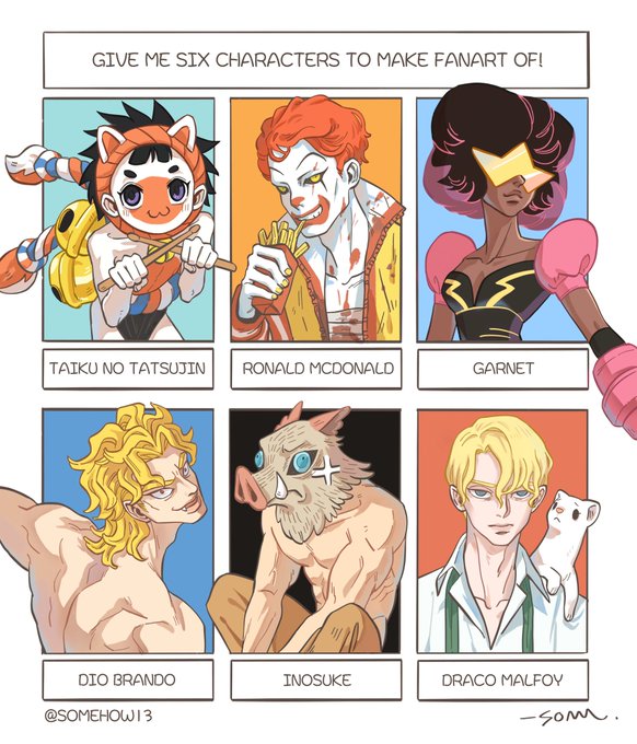 #SixFanartsChallenge #SixFanarts #sixcharacters #6fanarts #StevenUniverse #garnet #macdonald #taiku #jojo #dio #diobrando #DemonSlayer #DracoMalfoy #HarryPotter #fanart #illustration #inosuke #inosukehashibira