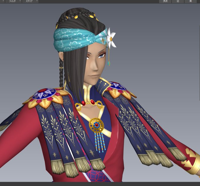 後頭部の髪型違う気がしたので修正ー!ターバンも幅広くして、資料集のラフに寄せてみた!袖のシルエットとかテクスチャも色々直したのでちょっとマシになったかな💦
