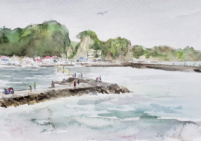 御宿町の大波月{だいはげつ}から右側の海岸線と、勝浦市の興津海岸。ダメな絵ですが、今日こんなんしか出来なかった。
