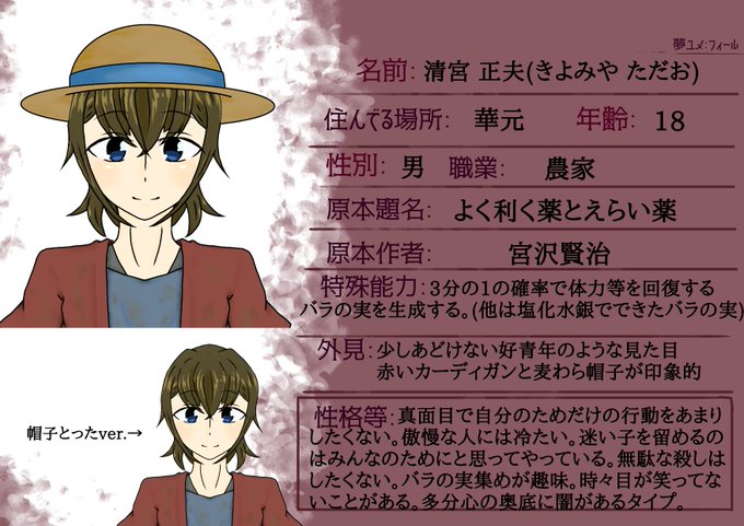 とても素敵な企画だったので参加させていただきます!バラの実集めが好きな農家の子です!私の好きな作品から作りました!ちょっと服が薄汚れてますがそんな正夫をよろしくお願いします!