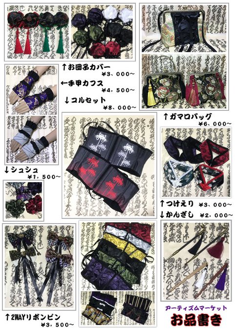 ギリギリ滑り込みで、明日の「アーティズムマーケットお品書き」が出来ました😅 この他にも柄違いなどを少々持って行く予定です=3=3 注)人気の彼岸花コルセットは持っていけて各色3本ずつ位!ですので、確実にゲットしたい方はご連絡下さい。 #アーティズムマーケット