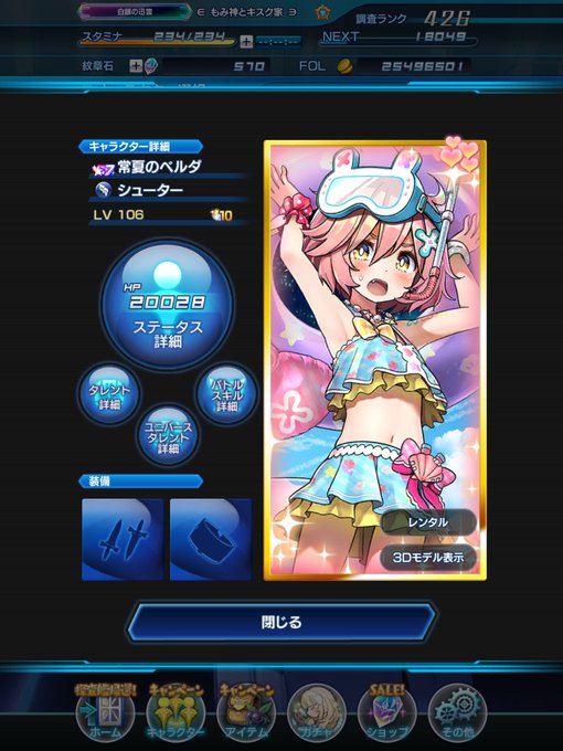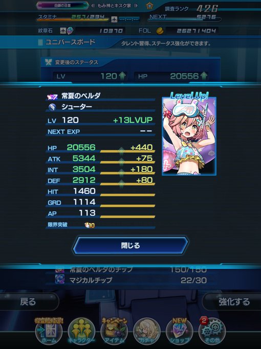 (´-`).。oO 不意に水着ベルダが120になってしまいました☺️ Lv120の方々マルチで遊んでください。 そして、ロマン砲RASHも悪くないのかもしれませんね😏 #アナムネシス