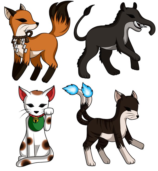 Yokai Chibis, Animal edition! In order, y'got the (good) Kitsune, Baku, Maneki Neko, and the Nekomata! Or a Bakeneko, whichever y'want.
