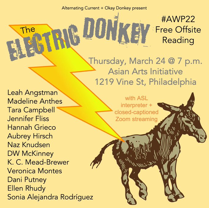 Going to AWP? Contributors @writesloud @meadwriter & @EllenRhudy (+many other cool people) are reading at @altcurrent & @okaydonkeymag's offsite event at @AsianArtsPhilly on 3/24!