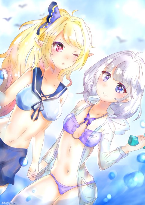 真夏の海をエンジョイするトライドルガールズ!✨🐠 ヴィンセントさんの渡した水着を間違えて交換しちゃったティナちゃんとファルファラさん、みたいな😋 #すぷコレ #白猫お絵描き