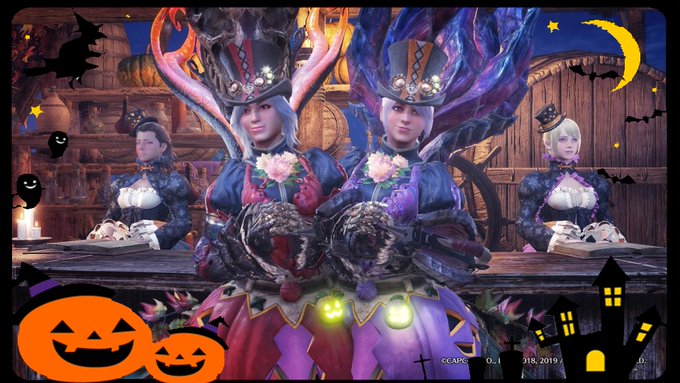 Happy Halloween🎃 お祭り仕様の集会所でジャスさんと撮影会! セリエナでは悪魔な格好、アステラでは魔女や集会所NPCのコスプレをしたり… こていれのリベンジで沢山撮れて楽しかったです!