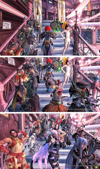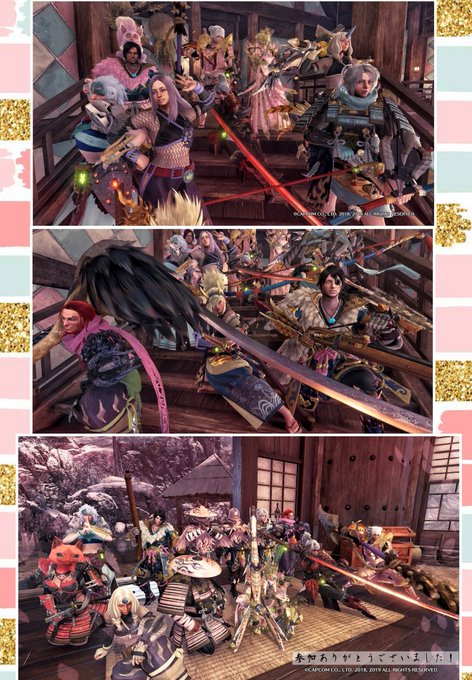 3月24日に開催した #春の宴を楽しむ会 にて! パステルカラーの和風コーデで狩り&お花見したり、各集会所で撮影会したり、今回も楽しい思い出をありがとうございました🌸 集合写真で特に指定してなかったのに武器を合わせてくださった皆さん好き…☺️ #MHWIB