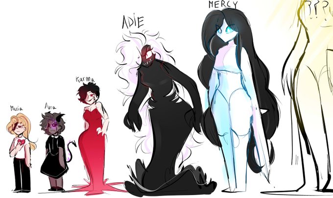 i did this as quick as i could bc its almost 3am meet my ocs, theyre all part of the same storyline and they're all a pain in my ass (except for mercy she'll cook you cereal and tuck you into bed)
