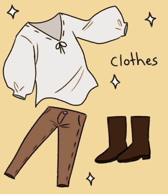 Seen in a previous reply, Rammi's clothes are very simple (yet fashionable). Not depicted is his sleepwear, which is a white nightgown in a similar fashion to his shirt in regards to the sleeves