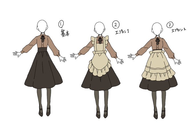 @natsuyuri_TL ブックカフェ制服案。珊珠にスカートのやつ見たいと言って頂いたので、それを基本に冬と夏のやつ考えてみました。色もそれに合わせて茶と青系。スカートは少しハイウェストだと良いな……エプロンは何種類かあってもかわいいなということでデザイン追加してみました。他デザインでも!