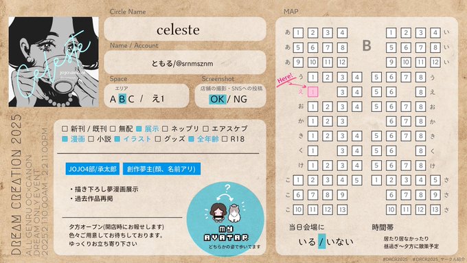 2月1日〜2日開催のオリキャラ夢主WEBオンリー『Dream Creation』様に参加します。 公開は夕方からになりますがよろしくお願い致します🙌 【スペース】Bえ1 【ジャンル】jo jo #DRCR2025_サークル紹介 #DRCR2025_お品書き