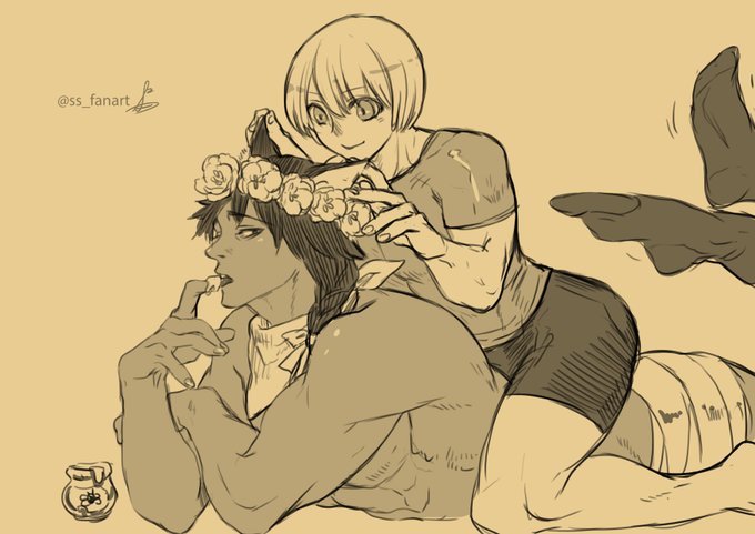#裸の推しにフォロワーさんから言われたものを足してく 裸の闘神に ・腹筋バキバキ今井コスモ ・リボン ・猫耳 ・スタイ ・はちみつ ・靴下 ・花 を足した結果です。ご査収ください。