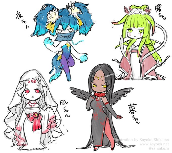 ちなみに四季シリーズなので全部で4枚描かせていただきます。 キャラメイクは済んでるよ! 暮ちゃんと夙ちゃんはちょっと細部変わるかもだけど概ねこんな感じ。 クトゥルフ界隈の方にはどれがどの方々をイメージしてるかわかるかな?