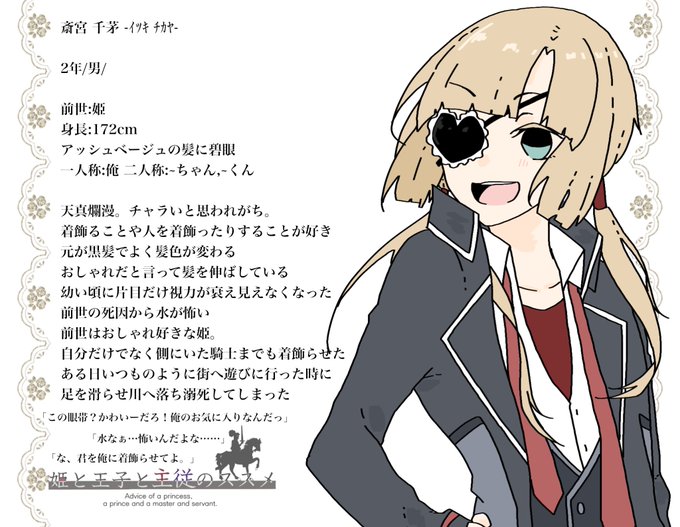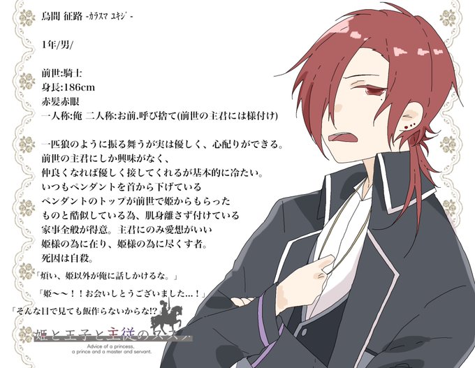 素敵な企画(@himesusu )に参加失礼します 前世は姫に尽くした騎士で、姫と仲のいい者以外には冷たく接する1年男子です 主従のみ事前貰っているので、それ以外の関係を募集しています、性別問いません✨ よろしくお願いします! #姫スス #姫スス_CS #姫スス_騎士