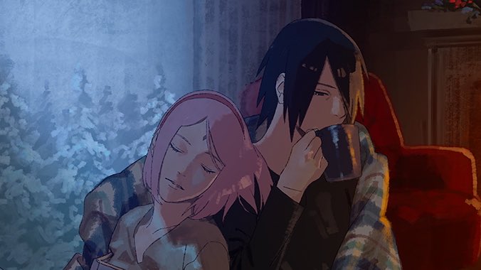 Sakura leaned on Sasuke's shoulder, Sarada fell asleep on Sasuke's thigh