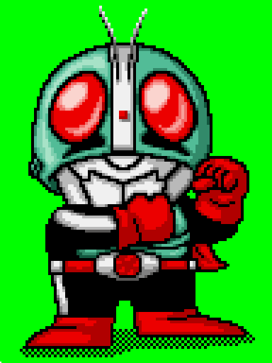 1号、2号、V3の勝ちポーズです。 元は96x128pix,15col V3のベルトにはしっかり「3」の文字が入っている所がポイント。 影は黒ベタにすると重過ぎるので、網状にドットを打ち疑似半透明にしています。 #pixelart #仮面ライダー #光ヒストリー